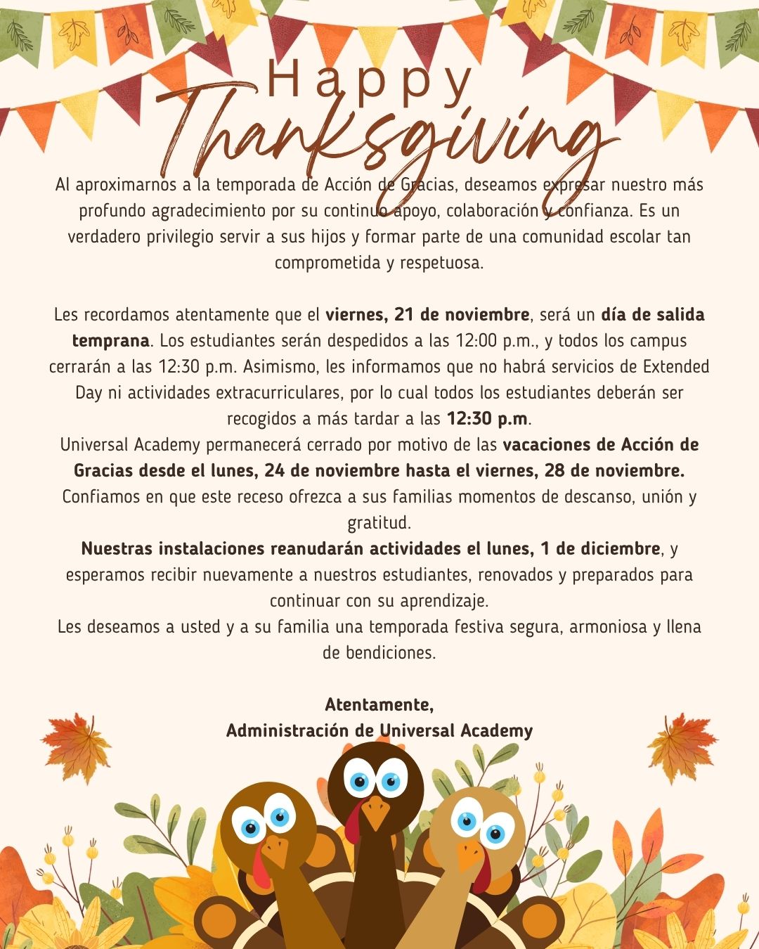 Nos gustaría recordarle que Universal Academy estará cerrada el lunes 17 de febrero de 2025 en conmemoración del Día del Presidente. Las clases se reanudarán el martes 18 de febrero a las 7:30 a.m.